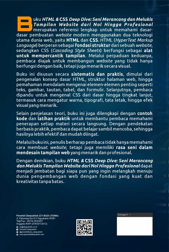 Buku berjudul HTML & CSS Deep Dive: Seni Merancang dan Melukis Tampilan Website dari Nol Hingga Profesional ini diterbitkan oleh Deepublish pada 8 Desember 2025. Buku setebal 242 halaman tersebut masuk dalam kategori ilmu komputer, ditulis dalam bahasa Indonesia, dan memiliki ISBN 9786342009420.